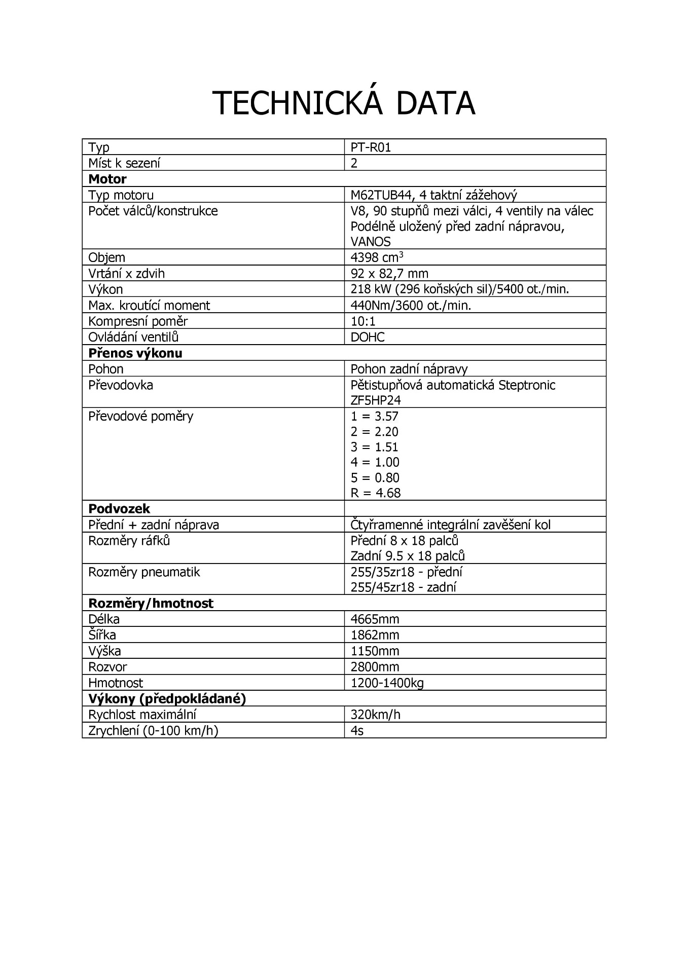 Srdcem našeho vozu je patřičně upravený motor M62 od BMW. Převodovka bude šestistupňová sekvenční od firmy Hewland. Netajíme se tím, že jsme se nechali inspirovat okruhovými závodními automobily ze zlaté éry osmdesátých let. Konstrukce proto vychází z těchto opravdových závodních speciálů. Nechceme aby náš vůz byl změtí kabelů, displejů a jiné elektroniky, naší filozofií je postavit ,,pure analog'' závodní automobil. Vše jednoduše a osvědčeně po staru. Chceme tak skloubit osvědčenou techniku s moderním nadčasovým designem a aerodynamikou.